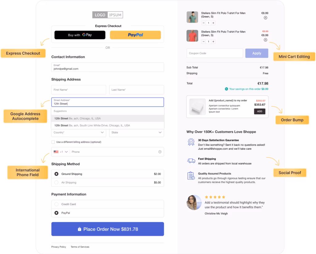 - Ein‑/Mehr‑Schritt‑Checkout – klarer Flow, weniger Reibung.